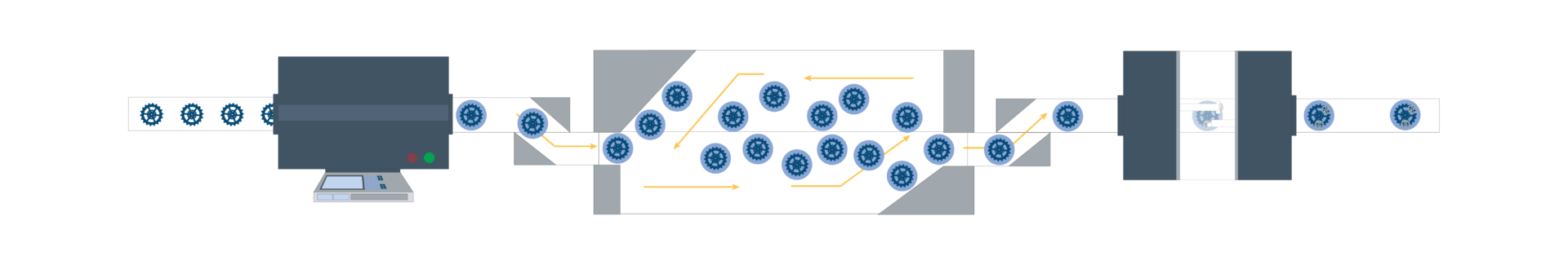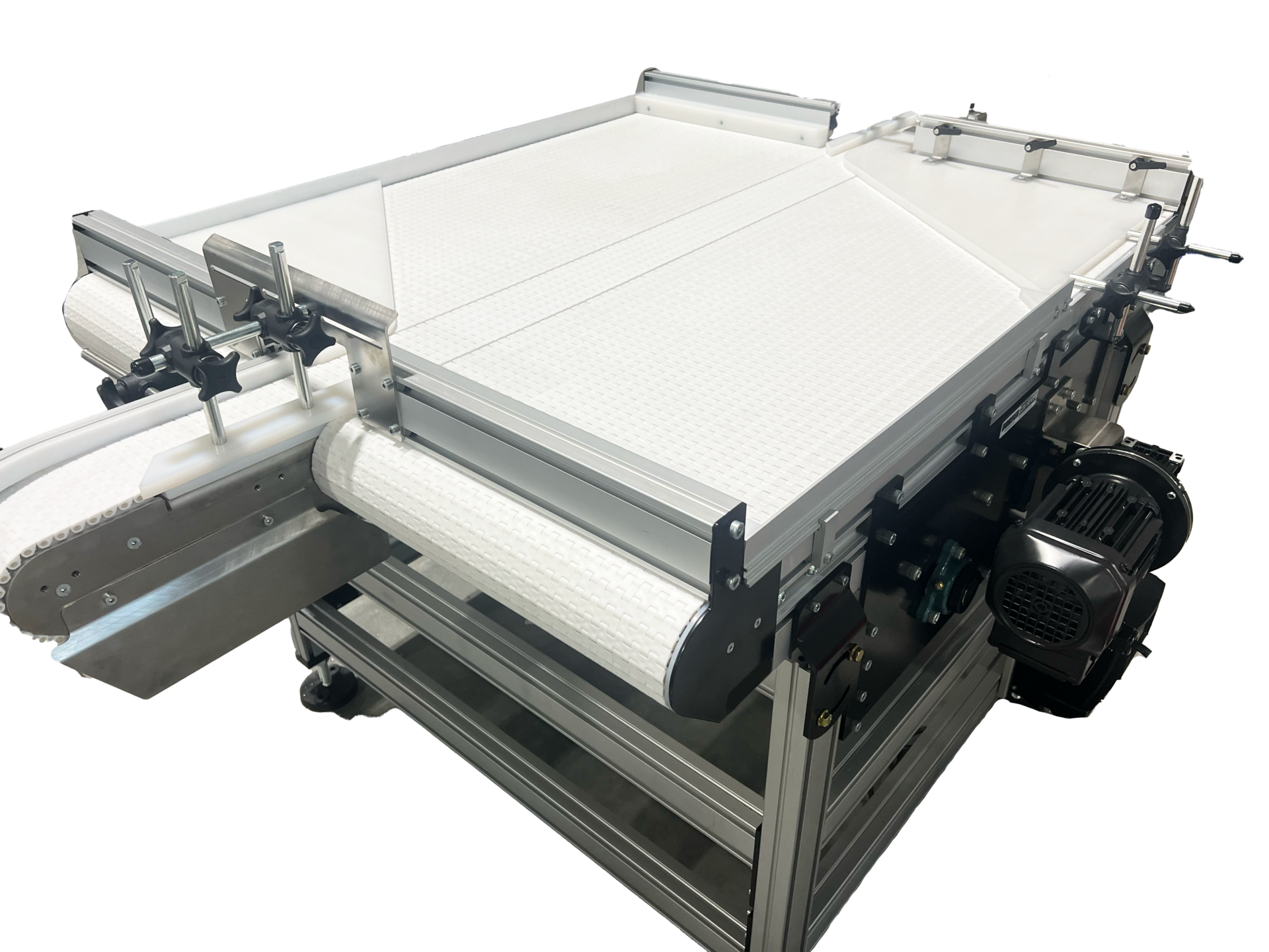 - Compact & Efficient Design: A single motor drives three modular chain sets in different directions, enabling product recirculation in a small footprint. The design is simple, robust, energy-efficient, and easy to integrate into existing lines.